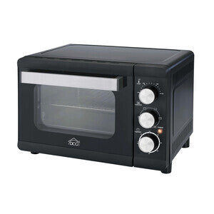 Four électrique ventilé, 220/240V 50/60 Hz - 1380W, Capacité 24 litres, Porte à double vitrage résistante aux hautes températures, 4 résistances en acier inoxydable, Sélecteur de température à 6 positions : supérieur, inférieur, supérieur et inférieur, supérieur + ventilation, inférieur + ventilation, supérieur et inférieur + ventilation, Températures réglables de 100 à 230°C, Minuteur 60 minutes avec arrêt automatique. Accessoires inclus : 1 plateau en aluminium, 1 grille, 1 poignée pour plateau. Dimensions 46x38xh31 cm.