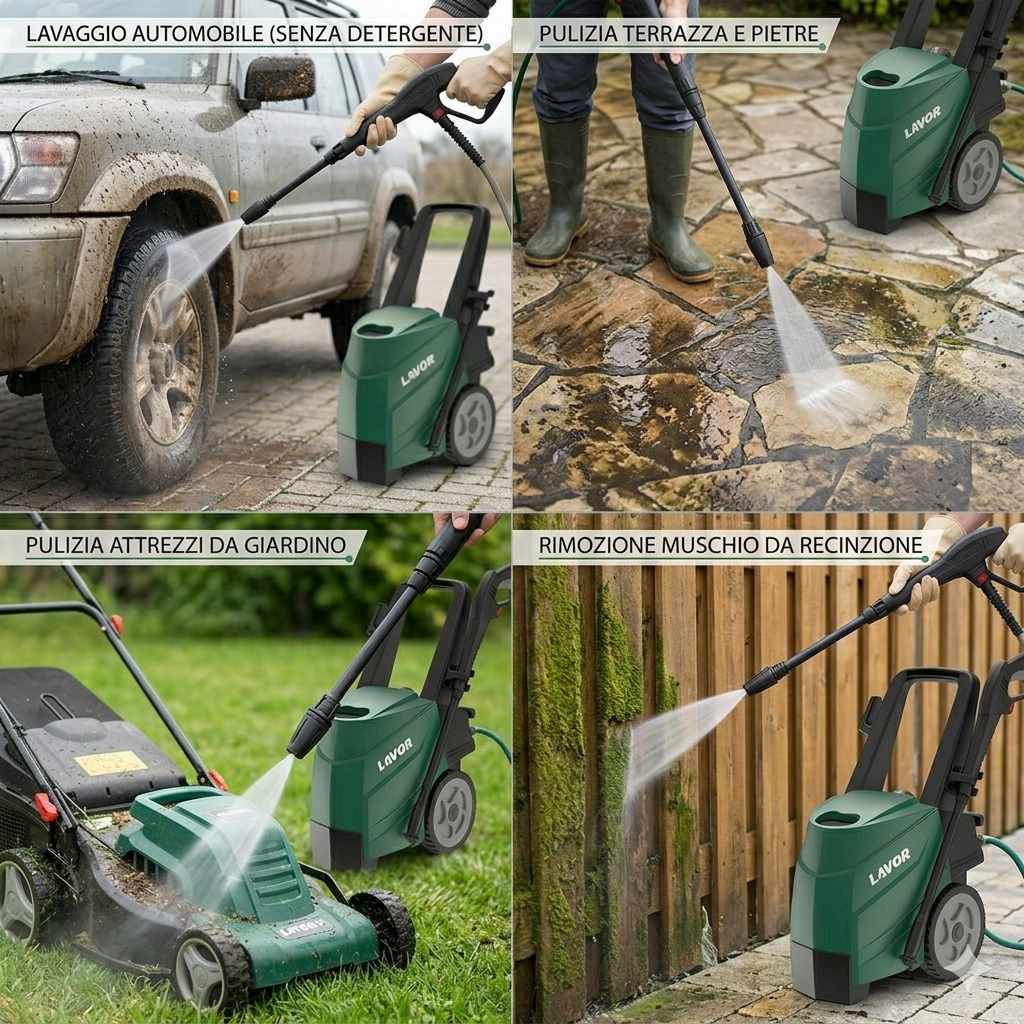 Idéal pour le lavage de véhicules, de machines de jardin, de sols et de murs extérieurs. Parfait également pour la désinfection d'environnements et le sablage de portails. Équipé du système Automatic Stop pour l'efficacité énergétique et la protection de la pompe.