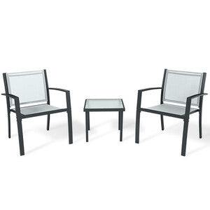 Struttura in acciaio. Seduta e schienale in textilene resistente agli agenti esterni. Composto da 2 poltrone con seduta 58 x 58 x h 75 cm e 1 tavolino 44 x 44 x h 38 cm con vetro temperato spessore 5 mm.