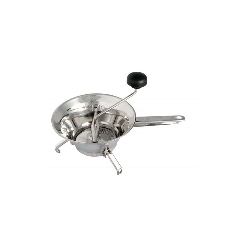 Realizzato in acciaio inox 18/10. In questa versione dispone di due piedini fissi per il posizionamento su recipienti di diversa capienza. Dimensione 24 cm, con tre dischi in acciaio inox con fori differenziati.