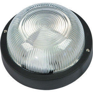In polipropilene con copertura in vetro. A norme EN 60598-1 e EN 60598-2-1. Portalampada E27 (attacco grande) per lampade ad incandescenza (max 60W) o a basso consumo (max 11W). Grado di protezione IP44. Base 188xh90 mm. Colore nero