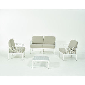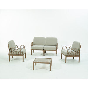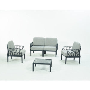 struttura in polipropilene rinforzato in fiblerglass. Antistatico, resistente ai raggi UV. Composta da: 1 divano 2 posti cm 140x75x78h2 poltrone cm 71,5x75x78h1 tavolino cm 75x62,5x37hColore antracite con cuscini.